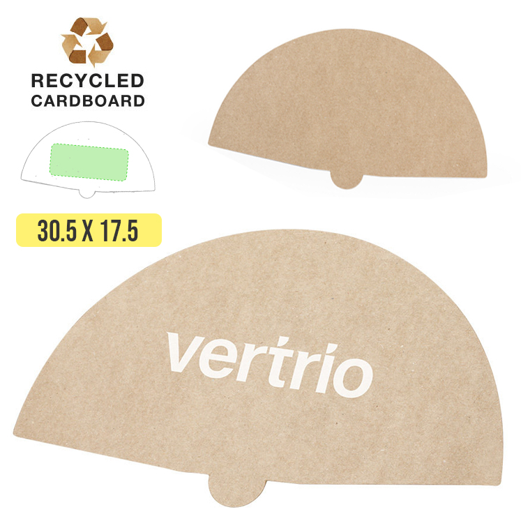 Abanico de línea nature fabricado en resistente cartón reciclado de 430g/m2, con amplia superficie de marcaje y en tono natural.
