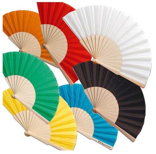 Abanico de línea nature con varillas fabricadas en resistente madera de acabado natural. Tela en resistente poliéster 190T, disponible en variada gama de colores y presentado en una caja de cartón individual blanca.