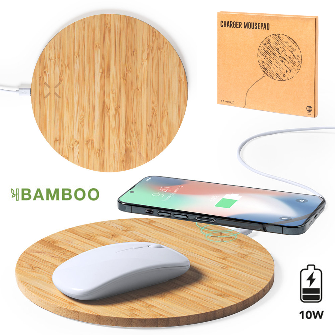 Alfombrilla cargador fabricada en resistente bambú natural, para ayudar a la sostenibilidad del planeta. Con cargador inalámbrico integrado de 10W -cable micro USB incluido-. Compatible con dispositivos equipados con tecnología de carga inalámbrica. Con base antideslizante y presentada en atractiva caja de diseño eco. Disponible manual de instrucciones en español e inglés. Inalámbrico 10W. Antideslizante