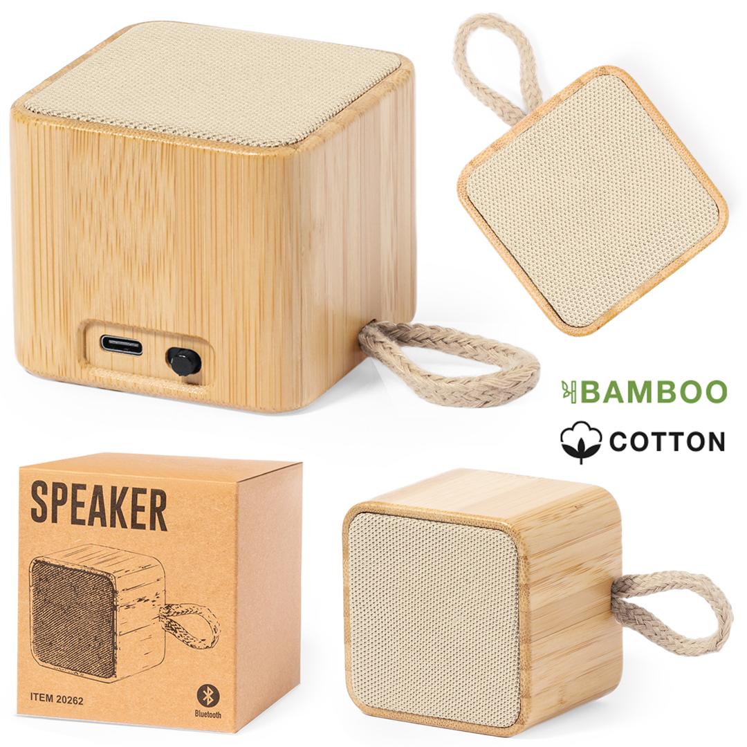 Altavoz inalámbrico con conexión Bluetooth® y 3W potencia. Con carcasa en bambú natural en combinación recubrimiento superior de algodón. De tamaño compacto y con práctica asa de transporte en algodón. Batería de litio de 300mAh, con cable de carga Tipo C incluido. Presentado en caja individual de diseño kraft. Disponible manual de instrucciones en español e inglés.Materiales como el bambú fomentan la utilización de materias primas naturales reduciendo las emisiones contaminantes. Proviene de una planta de gran resistencia, versatilidad de crecimiento y de regeneración rápida, siendo una excelente alternativa al uso de madera tradicional. Conexión Bluetooth. Potencia Sonido 3W. Batería 300 mAh