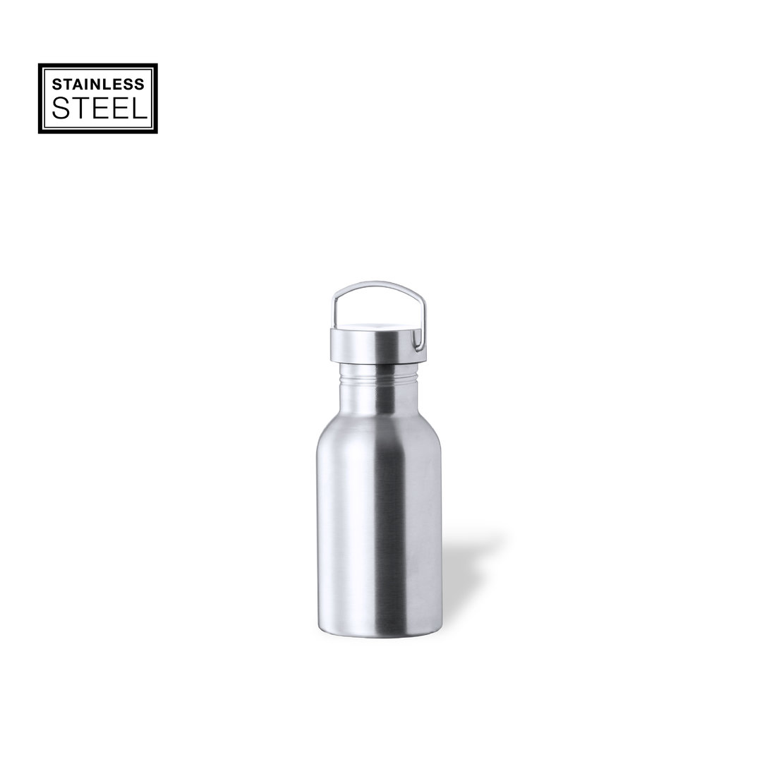 Bidón de 500 ml de capacidad, fabricado en acero inox de acabado brillo. Con original tapón a rosca en acero inox, a juego y con asa integrada. Libre de BPA y presentado en caja individual de diseño kraft. 500 ml