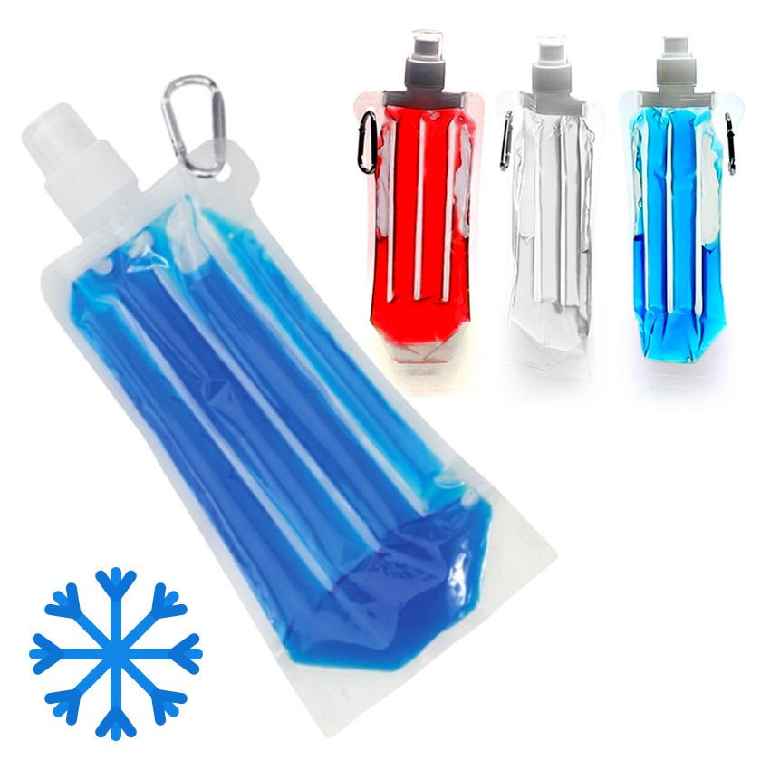 Bidón enfriador de 400ml de capacidad con cuerpo acabado en PET transparente y líquido refrigerante en vivos colores. Con tapón de seguridad a rosca y mosquetón metálico de transporte. 400 ml