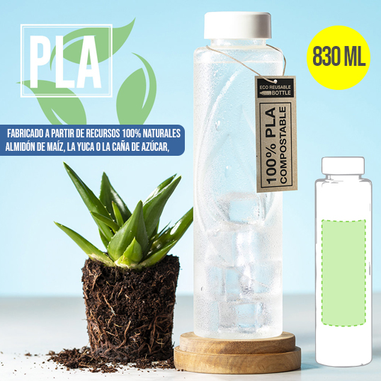 Bidón de linea nature de 830 ml de capacidad. Fabricado en resistente material PLA -Ácido PoliLáctico-, que se obtiene a partir de recursos 100% naturales como el almidón de maíz, la yuca o la caña de azúcar, pudiendo convertirse en 100% compostable al final de su ciclo de vida útil. Con distintivo PLA y presentado en bolsa individual de diseño eco. 830 ml