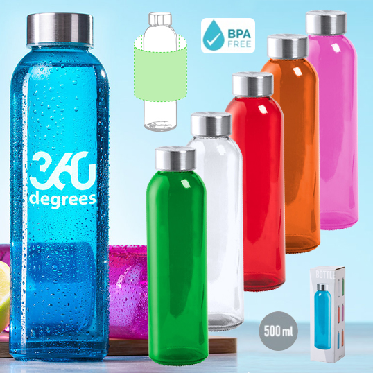 Bidón de cristal en alta calidad, de 500ml de capacidad, con cuerpo de acabado transparente en material libre de BPA y tapón a rosca en acero inox. Disponible en variada gama de colores. Presentado en atractiva caja de diseño. 500 ml