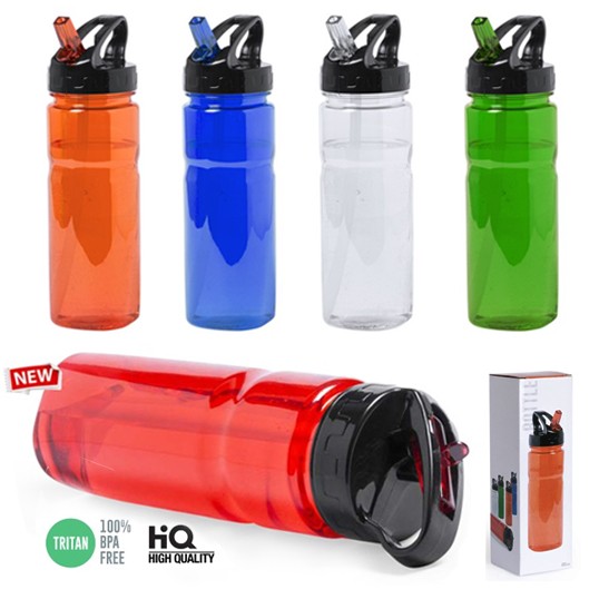 Bidón en alta calidad de 650ml de capacidad en material tritán resistente al calor y libre de BPA. Con dosificador, tapón a rosca de seguridad y disponible en variada gama de colores. Presentado en caja individual. 650 ml