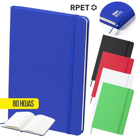 Bloc de notas de línea nature con tapas rígidas en 600D RPET, elaborado a partir de plástico reciclado para así fomentar la reutilización de residuos plásticos y contribuir a la sostenibilidad del planeta. Disponible en amplia gama de colores, incluye 80 hojas con disposición a una raya. Con elástico de sujeción y marcapáginas de tela a juego. Distintivo RPET en parte trasera. Portada Rígida. 80 Hojas