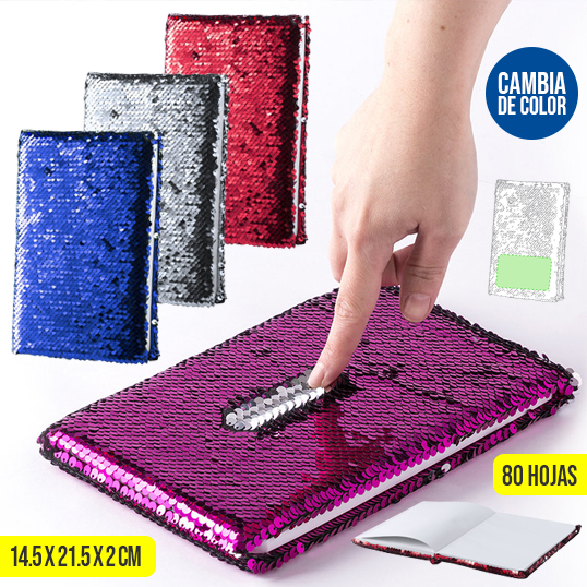 Bloc de notas interactivo de lentejuelas en llamativos colores metalizados. Al deslizar el dedo por las lentejuelas la superficie cambia de color. Incluye 80 hojas blancas lisas. Portada Rígida. 80 Hojas