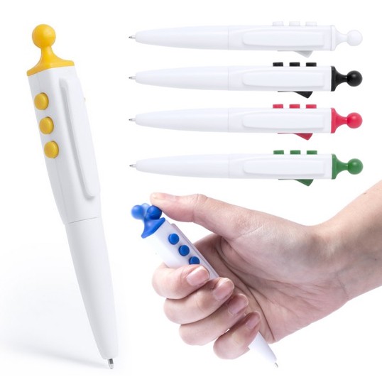 Relajante bolígrafo antiestrés con multitud de botones para pulsar y bolita flexible en parte superior. De mecanismo giratorio, con cuerpo en color blanco y accesorios en variada gama de vivos colores. Tinta azul.