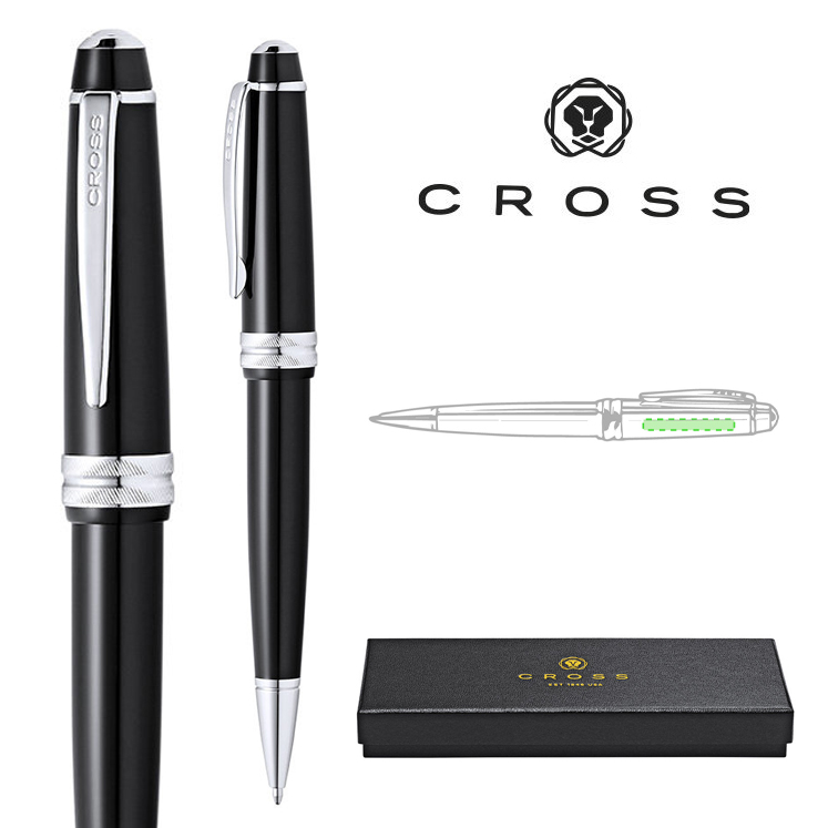 Bolígrafo de Cross modelo Bailey Light, que combina una resina de alto brillo con acabados metálicos de cromo pulido. De cartucho jumbo y en tinta negra. Presentado en elegante estuche individual de color negro con logotipo de la marca, e interior en suave antelina a juego. Tinta Negra