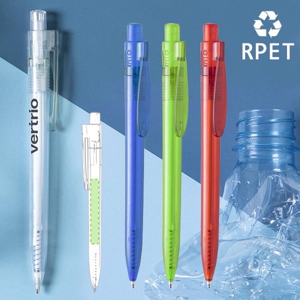 Bolígrafo de línea nature en material RPET, elaborado a partir de plástico reciclado para así fomentar la reutilización de residuos plásticos y ayudar a la sostenibilidad del planeta. De acabo translúcido y original clip, con distintivo RPET en el cuerpo del bolígrafo y disponible en variada gama de colores. Especialmente diseñado para marcaje en tampografía, de mecanismo pulsador y con tinta azul.