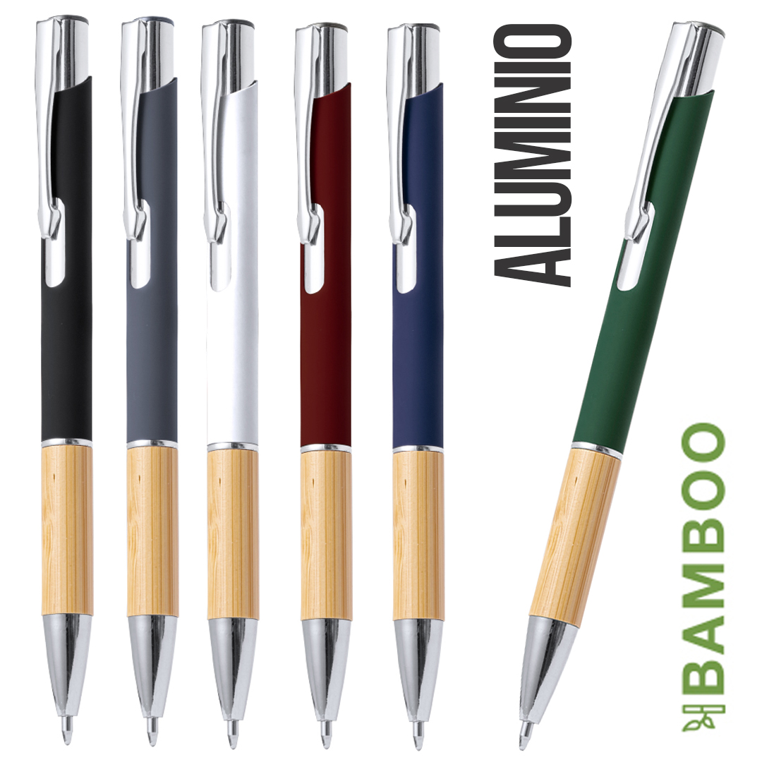 Elegante bolígrafo de línea nature y mecanismo pulsador. Cuerpo en resistente aluminio de acabado goma y empuñadura en bambú, con la caña en una amplia gama de distintivos colores. Clip metálico, con mecanismo pulsador y en tinta azul. Presentado en bolsa individual reciclada.