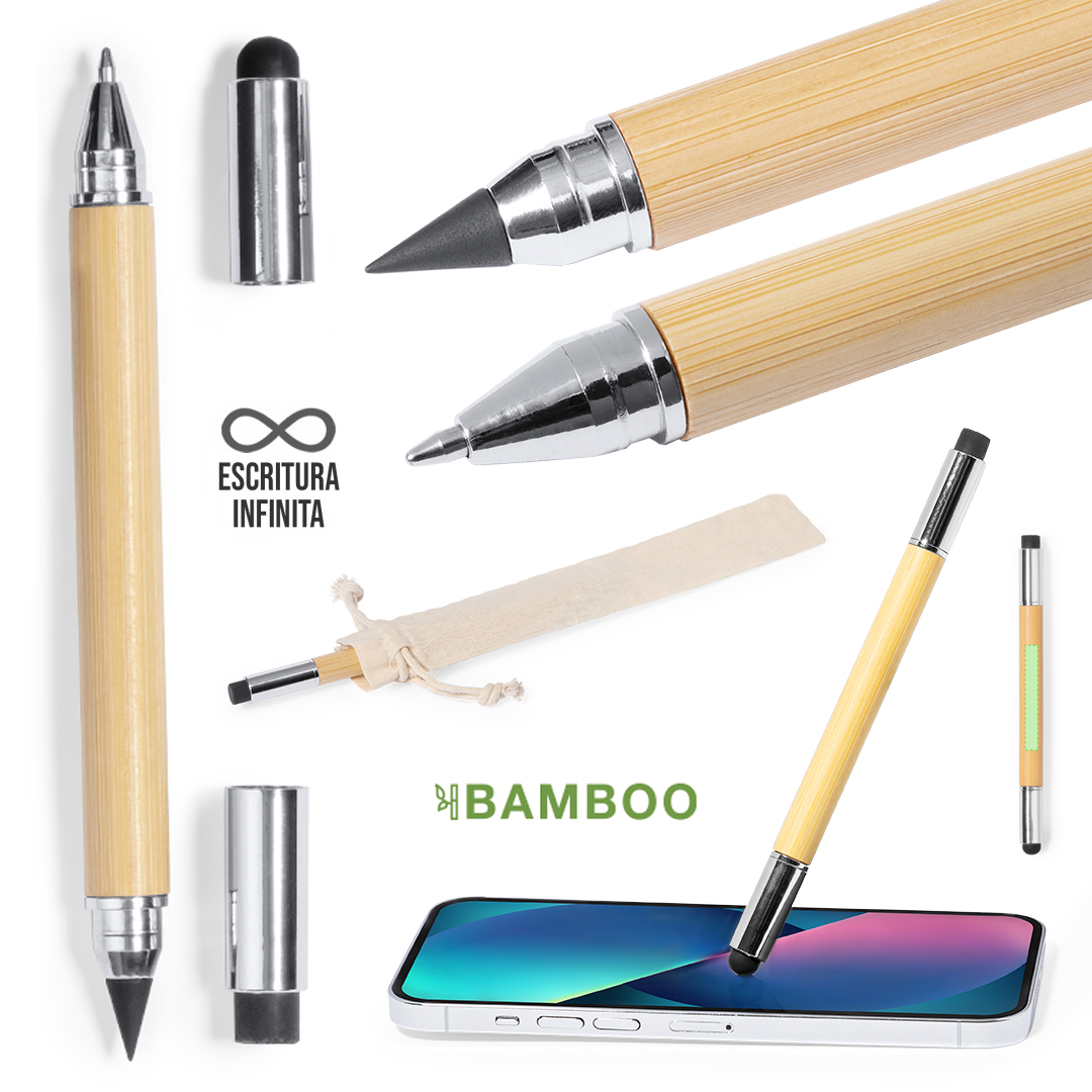 Bolígrafo lápiz eterno 2 en 1, fabricado en bambú, con cuerpo de suave acabado y accesorios cromados. Con cierre de capucha con borrador y puntero en cada extremo, incluye bolígrafo en un extremo (carga jumbo y tinta azul), y lápiz eterno en el otro extremo, para así usar siempre el mismo lápiz y no generar residuos. Presentado en funda de algodón 100%, con cordón de cierre. Carga Jumbo. Funda Algodón