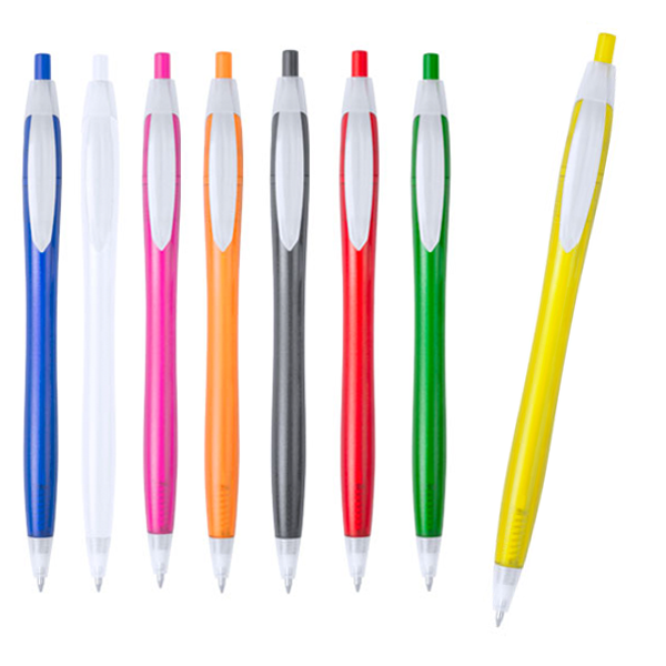 Bolígrafo de mecanismo pulsador de atrevido diseño bicolor y cuerpo curvado, de suave acabado en divertidos colores translúcidos y con clip plano. Tinta azul.