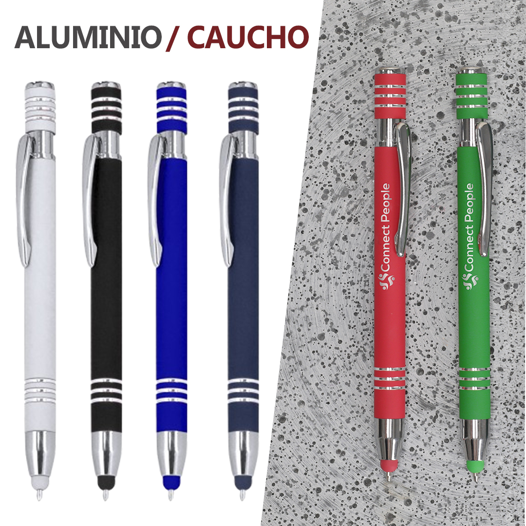 Bolígrafo puntero con mecanismo pulsador, fabricado en aluminio. Cuerpo con acabado de caucho, efecto gomoso. Especialmente diseñado para el marcaje a láser, revelando el logotipo en tono plateado. Incluye accesorios cromados y clip a juego. Tinta azul.