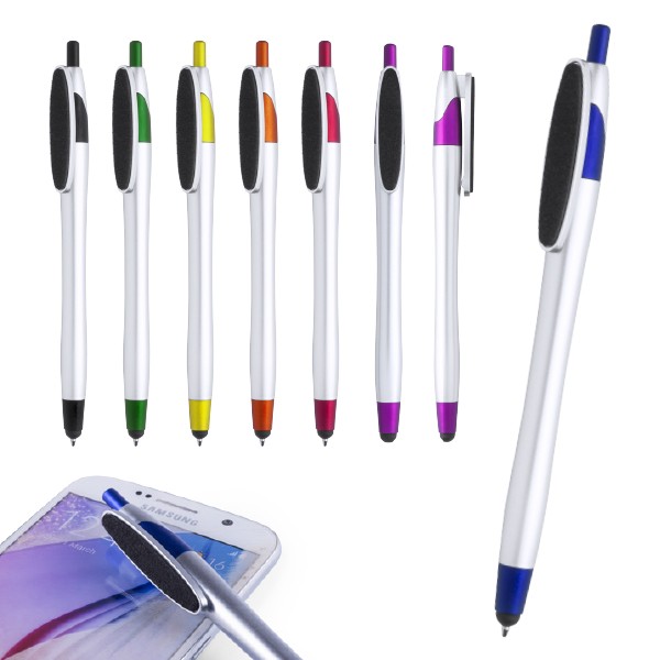 Bolígrafo puntero de mecanismo pulsador de atrevido diseño bicolor con accesorios en vivos colores y cuerpo curvado de suave acabado metalizado en color plateado. Original clip limpiador de pantalla integrado y tinta negra. Tinta Negra. Limpiapantallas Incluido