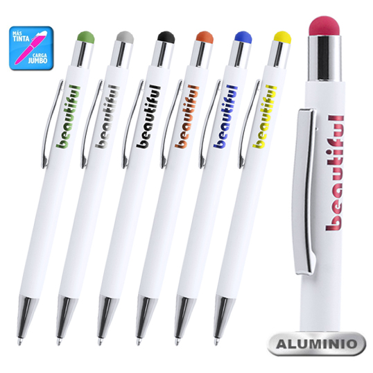 Bolígrafo puntero de mecanismo pulsador con cuerpo de aluminio en elegante color blanco mate. Puntero en variada gama de colores, a juego con el color del interior y con detalles cromados. Recubrimiento exterior especialmente diseñado para marcaje en láser, con el que conseguirá que su publicidad o marca quede perfectamente grabada en color a juego con el del interior. Con cartucho jumbo y tinta azul. Carga Jumbo