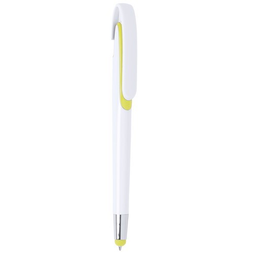 Bolígrafo puntero de mecanismo pulsador con cuerpo de acabado brillante en color blanco y accesorios en variada gama de vivos colores. Con clip maxi y tinta azul.