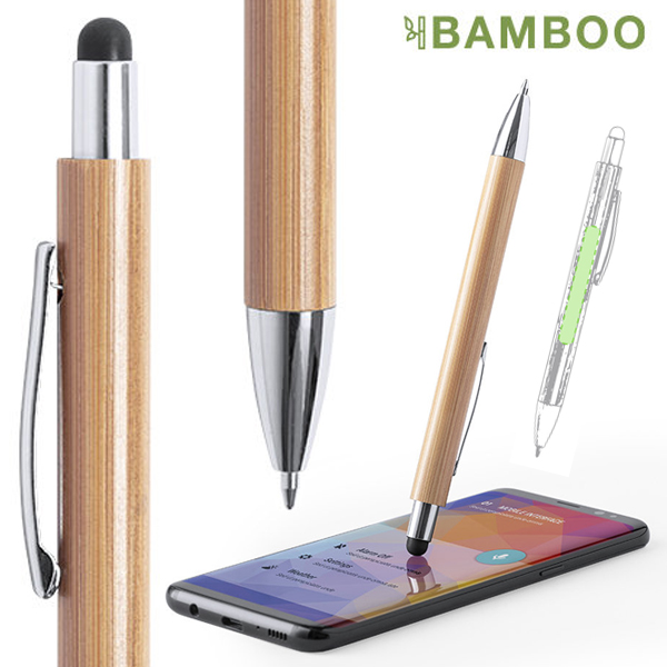 Bolígrafo puntero de línea nature, con cuerpo en bambú y accesorios cromados, con puntero en negro. De mecanismo pulsador, clip metálico y cartucho jumbo con tinta azul. Carga Jumbo