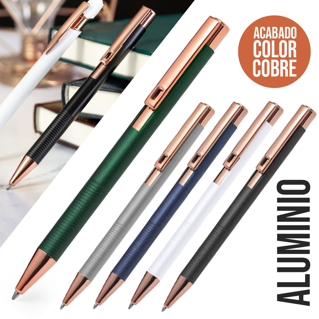 Excelente bolígrafo de aluminio con mecanismo pulsador. Cuerpo en resistente aluminio de acabado mate con elementos decorativos de elegante acabado color cobre, con la caña en una amplia gama de distintivos colores. Clip metálico, con pulsador retráctil de tinta azul y carga jumbo. Presentado en una bolsa individual reciclada. Carga Jumbo