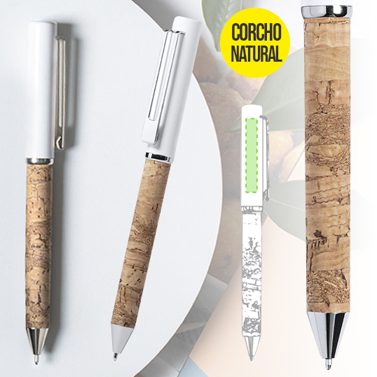 Bolígrafo de línea nature en combinación de corcho natural y metal. Con original clip metálico de acabado cromado, a juego con la punta y la anilla. Parte superior en color blanco, de mecanismo giratorio y con tinta azul. Presentado en caja individual de diseño eco.