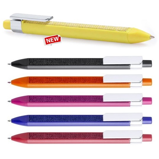 Original bolígrafo de mecanismo pulsador con diseño cuadrangular y suave tira de tela a juego integrada en cuerpo. En variada gama de vivos colores y con clip rectangular para marcaje. Tinta azul.