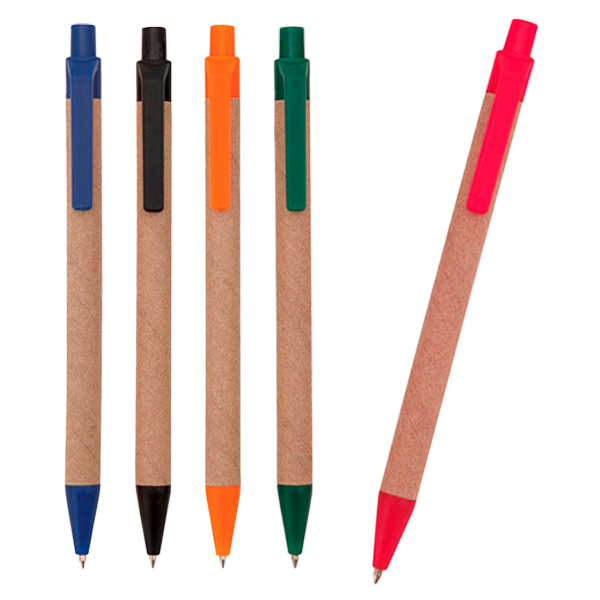 Bolígrafo de mecanismo pulsador en original combinación de cuerpo en cartón reciclado de color natural y accesorios en vivos colores. Tinta azul.