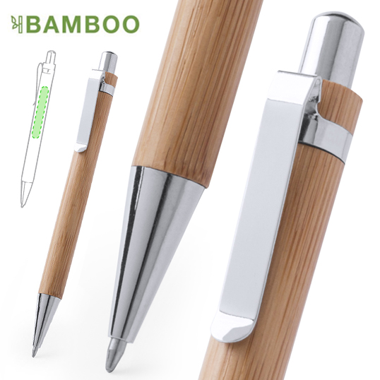 Elegante bolígrafo de mecanismo pulsador con cuerpo en madera de bambú natural y accesorios de acabado metálico en color plateado brillante. De cartucho jumbo y tinta azul. Carga Jumbo