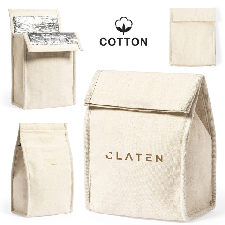 Bolsa térmica en resistente material 100% algodón de 330g/m2. Compartimento principal con cierre de velcro e interior isotermo de aluminio. Capacidad 2,3l.