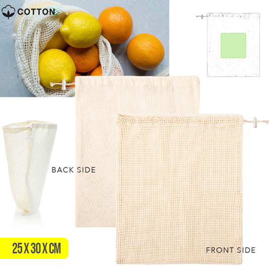 Bolsa de redecilla de línea nature en algodón crudo de 120g/m2, con una cara lisa para impresión. Cierre de cordón con accesorio de ajuste.