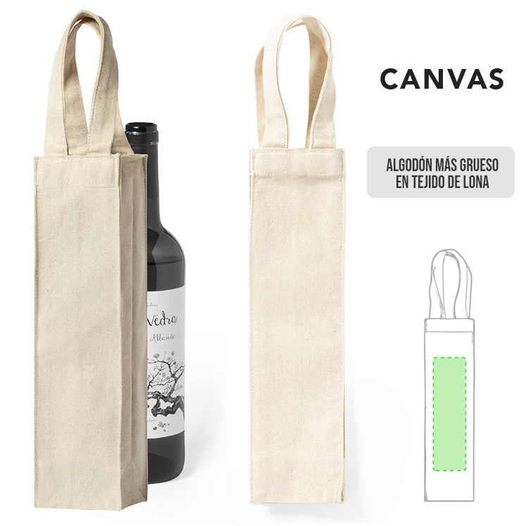 Bolsa de canvas de 220g/m2 para botella de vino de 75cl. En color natural, con resistente acabado cosido y asas reforzadas.