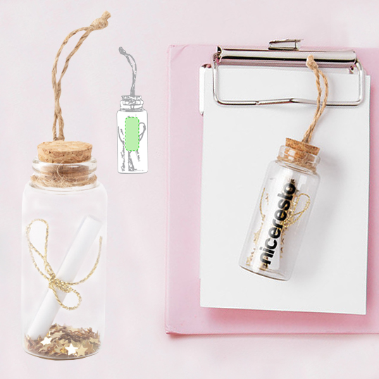 Botecito para guardar tus mejores deseos de esta navidad. Incluye pergamino de papel y bote en cristal. Con tapón y lacito para colgar, presentado en cajita blanca individual