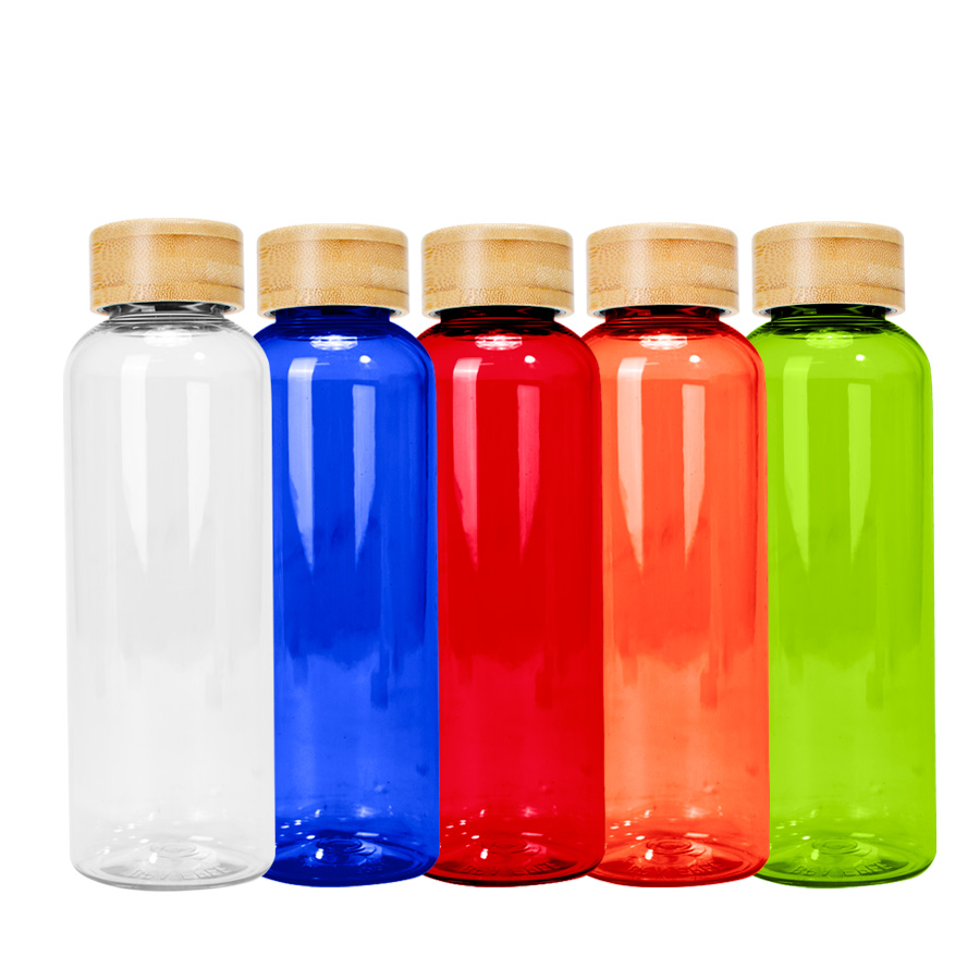 Botella plástica PET color translúcido, con tapa redonda twist-off de Bamboo, modelo "AINOA". Producto BPA FREE, para el contacto con líquidos y alimentos. Capacidad 550ml. Presentación en bolsa OPP + caja de regalo de cartón kraft.