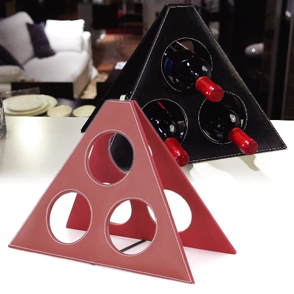 Botellero plegable con capacidad para 3 botellas en elegante polipiel de sobrios colores rosado y tinto. Con pespuntes de refuerzo en color blanco.