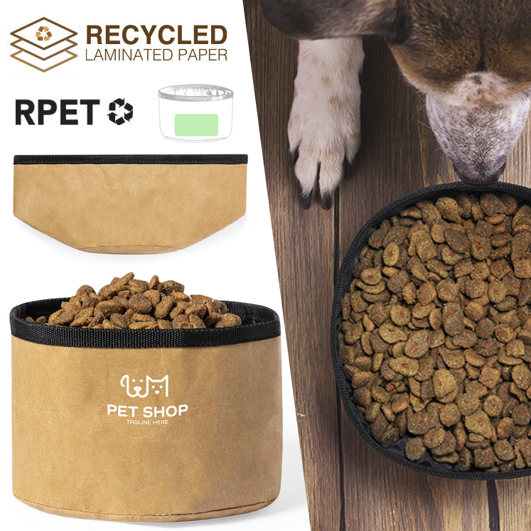 Bowl plegable para mascotas de 1,3l de capacidad, con exterior en resistente papel reciclado laminado de 270g/m2. Interior en poliéster RPET, elaborado a partir de plástico reciclado, para así fomentar la reutilización de residuos plásticos y ayudar a la sostenibilidad del planeta. Apto para sólidos y líquidos.