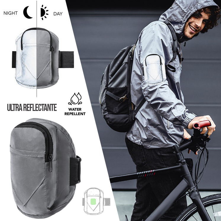 Brazalete deportivo en poliéster 210T, fabricado empleando tejido con gran capacidad para reflejar intensamente la luz, gracias a millones de pigmentos reflectantes y basándose en el principio de la retro-reflexión de la luz, una propiedad de visibilidad nocturna que consiste en la refracción de la luz hacia la fuente de origen de la misma. Bolsillo principal con cierre de cremallera y bolsillo frontal con cierre de velcro. Con tira ajustable elástica y resistente al agua. Reflectante