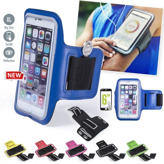 Brazalete deportivo táctil, diseñado para dispositivos con pantalla de hasta 6 pulgadas. Frontal reflectante, con tira de cierre elástica y ajustable, y bolsillo para llaves. Disponible en variada gama de colores. Pantalla Táctil. Reflectante