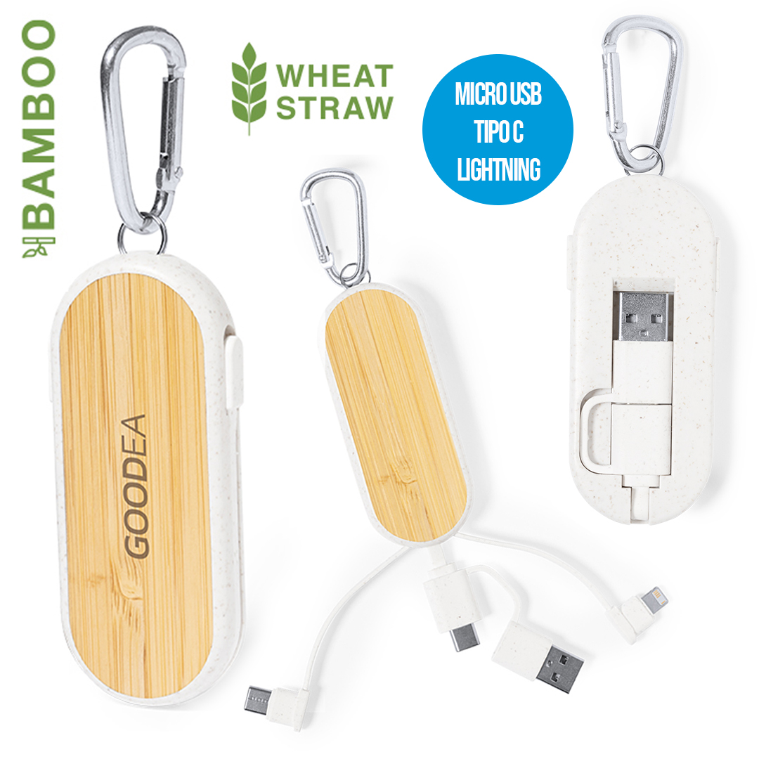 Cable cargador con mosquetón fabricado en fibra de trigo y bambú. Con conexiones de entrada Tipo C y USB y salidas Tipo C, lightning y Micro USB. 5V DC 2A. Presentado en bolsa individual de diseño kraft.Elaborado con elementos vegetales para así fomentar la utilización de materias primas naturales y reducir las emisiones contaminantes. Conexión Micro USB, Tipo C y Lightning 5V DC 2A