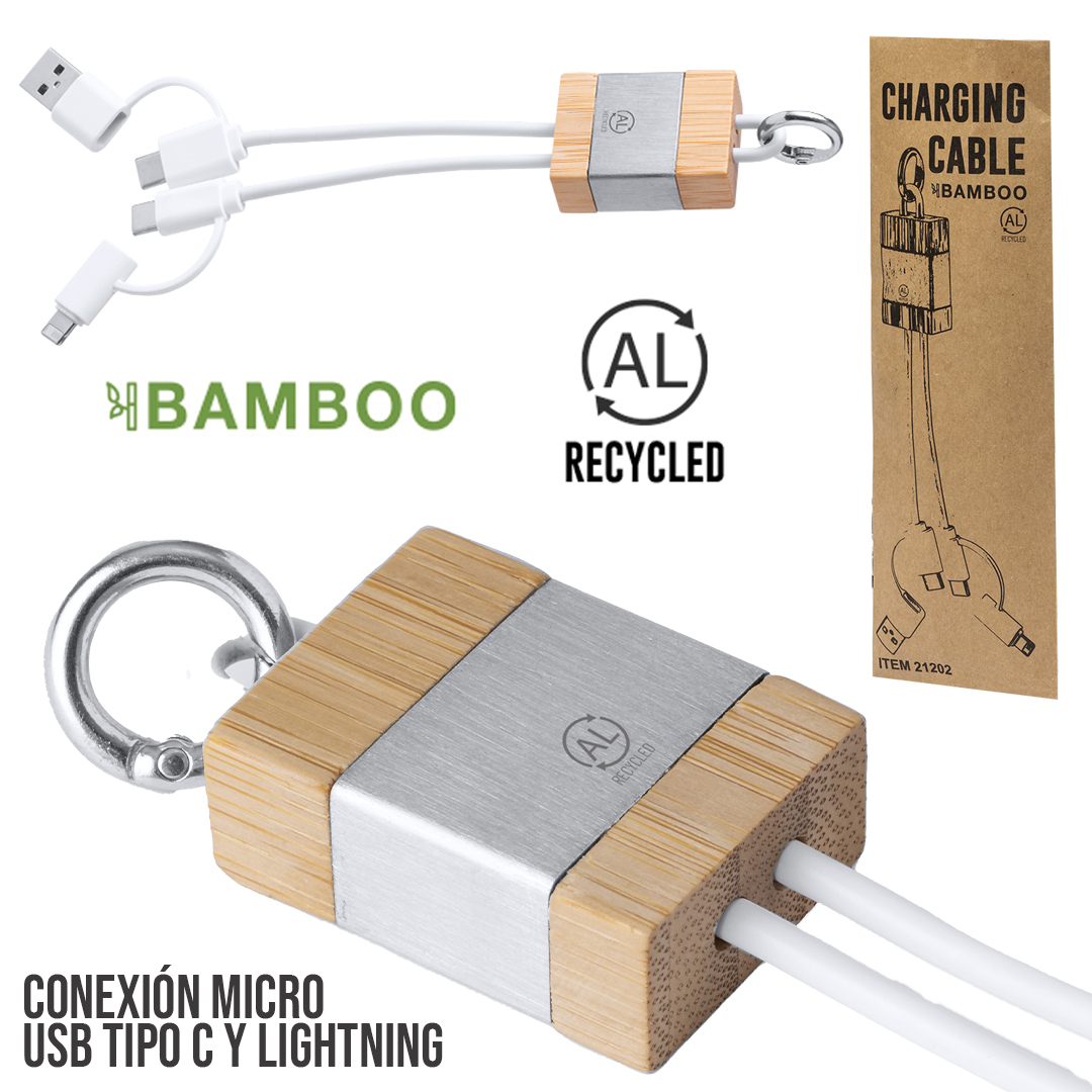 Cable cargador fabricado en bambú y Aluminio Reciclado. De tamaño compacto y con original anilla mosquetón de transporte. Conexiones de entrada Tipo C y USB + salidas Tipo C, Lightning y Micro USB. 5V DC 2.4A. Con logotipo Aluminio Reciclado y presentado en caja individual de diseño kraft. Materiales como el bambú fomentan la utilización de materias primas naturales, reduciendo las emisiones contaminantes. Proviene de una planta de gran resistencia y versatilidad, con crecimiento y regeneración rápidos, siendo una excelente alternativa al uso de madera tradicional. El Aluminio Reciclado es un material con posibilidades de reciclaje casi infinitas, sin perder sus propiedades originales y consumiendo menos energía en este proceso. Certificación GRS (Global Recycled Standard / Estándar de Reciclaje Global), que garantiza el origen reciclado del material usado para fabricar el producto. Conexión Micro USB, Tipo C y Lightning 5V DC 2.4A
