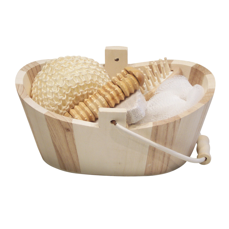 Canasto SPA de belleza en madera modelo "Naturals". Contiene cepillo de pelo, esponja malla, masajeador de madera, piedra pomez y esponja de masaje corporal.