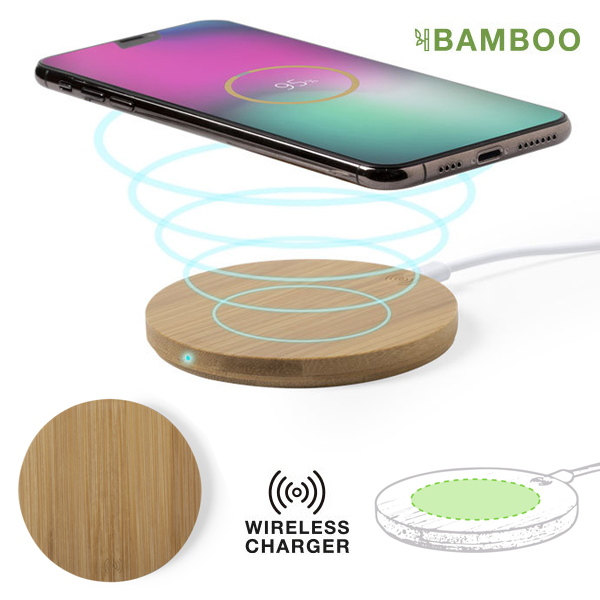 Cargador inalámbrico de línea nature y diseño circular. Carcasa en bambú procedente de cortes naturales. Indicador de estado de carga y compatible con dispositivos equipados con tecnología de carga inalámbrica. Amplia superficie de marcaje y presentado en atractiva caja de diseño eco. Inalámbrico 10W