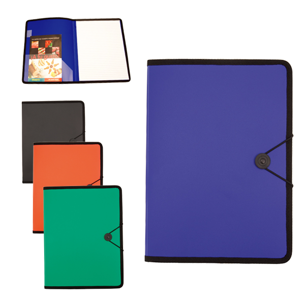 Carpeta con original cierre elástico en variados colores, de acabado brillante con ribete reforzado en negro. Interior con bloc extraíble de 30 hojas lisas, bolsillo transparente de solapa, tarjetero y soporte para bolígrafo. Bloc 30 Hojas