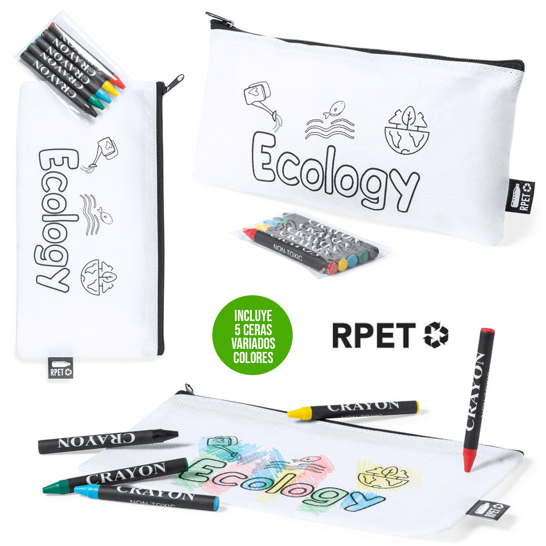 Estuche fabricado en non-woven RPET de color blanco, con cierre de cremallera y tirador metálico. Especialmente diseñado para colorear con ceras. Incluye 5 ceras en variados colores y distintivo RPET en etiqueta exterior. 5 Ceras Incluidas