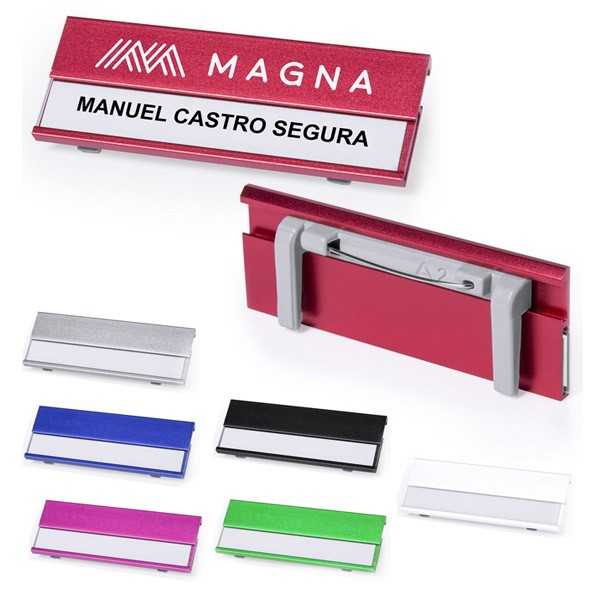 Identificador de aluminio en vivos colores y pinza trasera de enganche para una fijación segura.