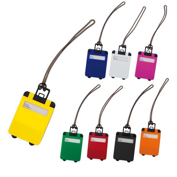 Original identificador de maletas de diseño de trolley en resistente material de combinación bicolor y extensa gama de vivos colores. Con resistente cinta de acople y tarjeta de identificación en castellano e inglés.