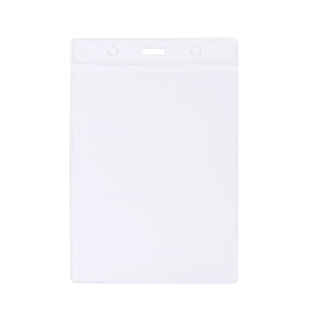 Identificador vertical de PVC. Práctico porta acreditaciones con parte superior reforzada y perforaciones tanto para la sujeción central como en los laterales.