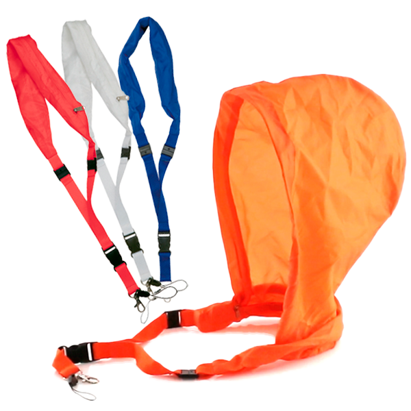 Lanyard en resistente y suave poliéster de variados colores con gorro impermeable en nylon integrado en cuello y cierre de cremallera. Desmontable con cierres de clip y accesorios mosquetón metálico y cinta. Impermeable. Cierre Seguridad