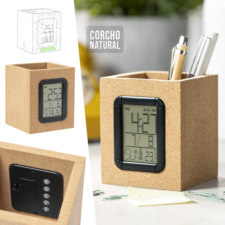 Lapicero de línea nature con reloj multifunción integrado. Fabricado en corcho natural, con funciones termómetro, calendario y alarma. Alimentación a pilas (de botón incluidas) y presentado en atractiva caja de diseño eco. Pilas Botón Incluidas