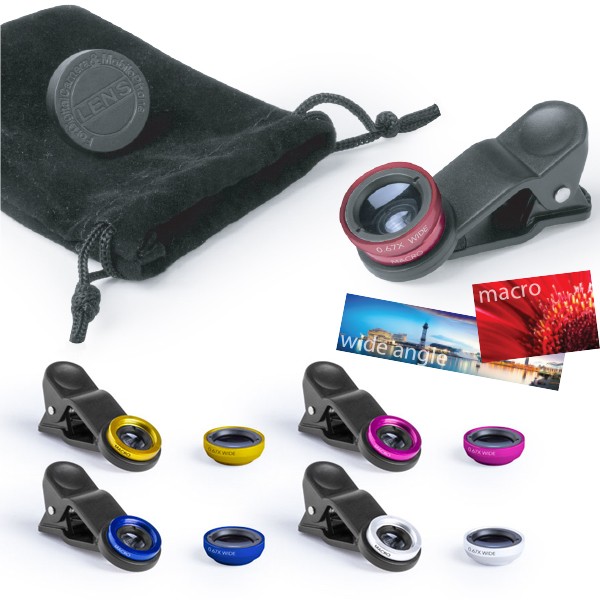 Set de lentes universales para smartphone, ajustables a la cámara mediante pinza. Lentes de aluminio y cristal, con efectos -macro- y -gran angular-, con paño limpiador de microfibra y presentadas en una bolsita de terciopelo con cordones autocierre. Set presentado en atractiva caja de diseño. 2 Lentes Cristal/ Aluminio. Funda Poliéster