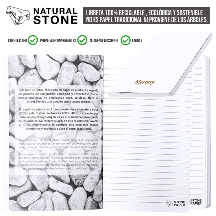 Composición: Papel fabricado a base de extractos de piedra