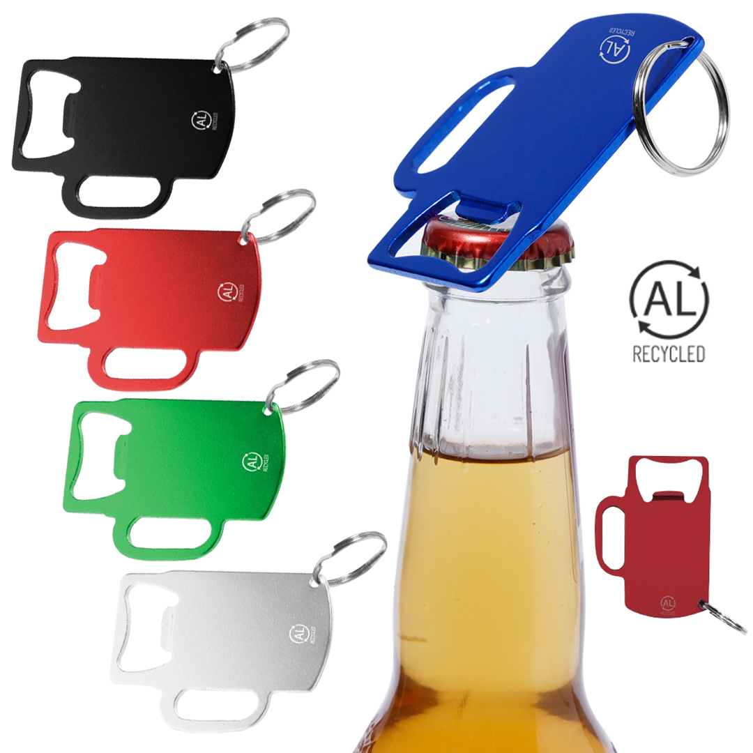 Original llavero abridor en Aluminio Reciclado con diseño de jarra. Especialmente diseñado para marcaje en láser. Con distintivo de Aluminio Reciclado grabado.El Aluminio Reciclado es un material con posibilidades de reciclaje casi infinitas, sin perder sus propiedades originales y consumiendo menos energía en este proceso.Certificación GRS (Global Recycled Standard / Estándar de Reciclaje Global), que garantiza el origen reciclado del material usado para fabricar el producto.